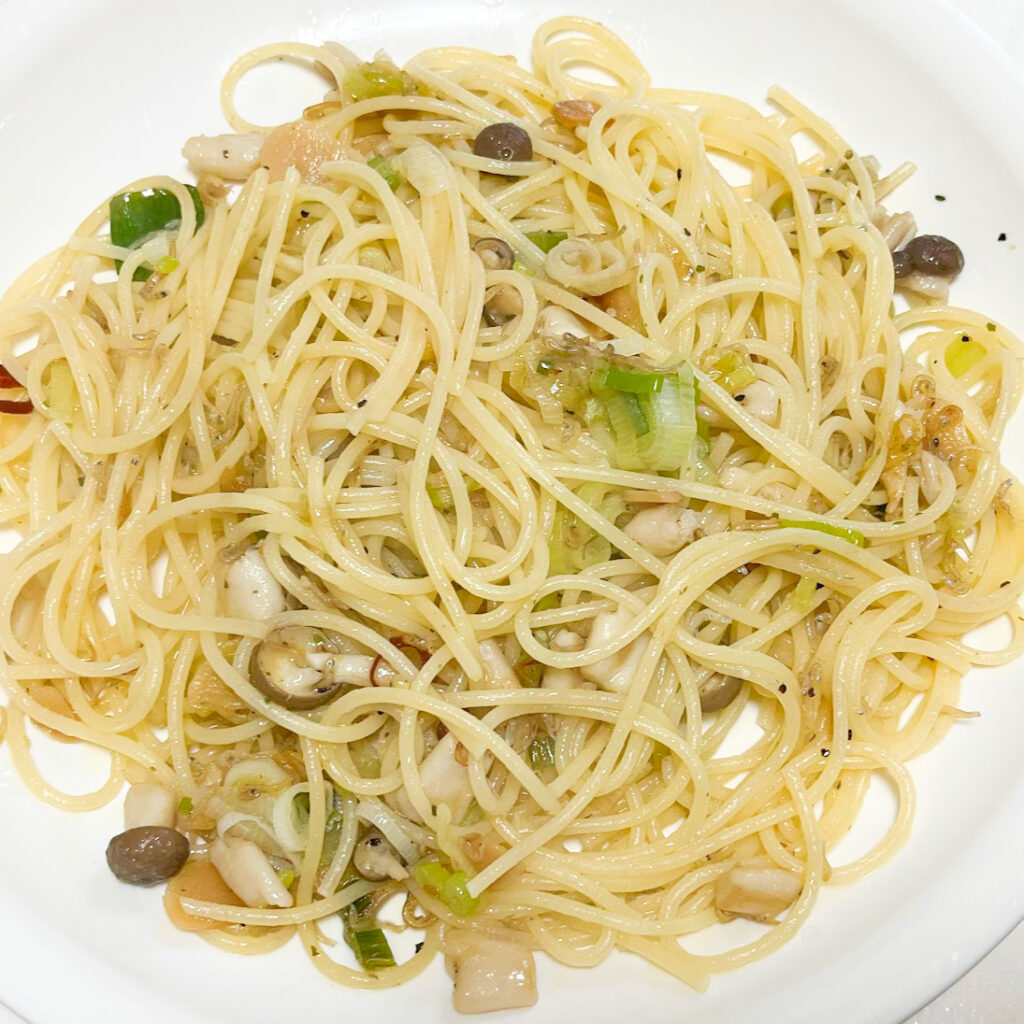 しらすのオリーブオイル&唐辛子漬け「ぺろっとペペロン」を使ったペペロンチーノ。
