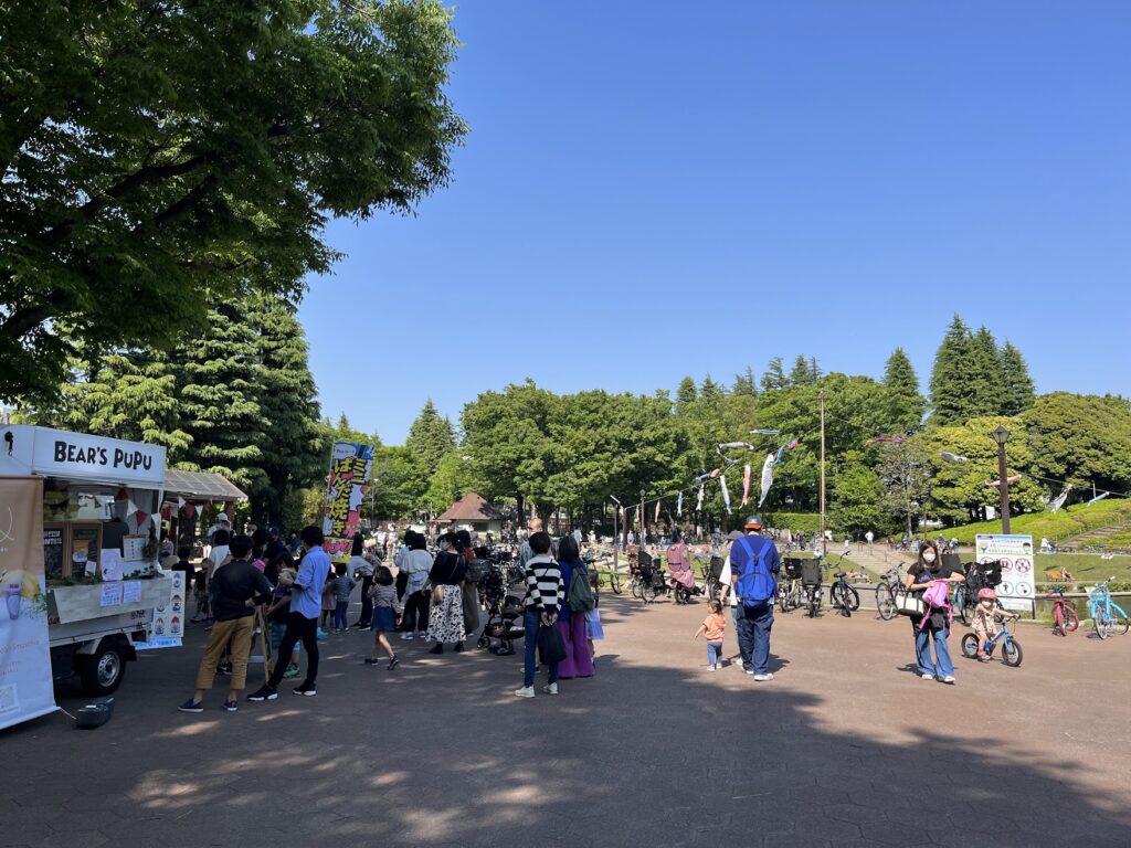 世田谷公園ではみんな芝生にシートを拡げて寝転んだり