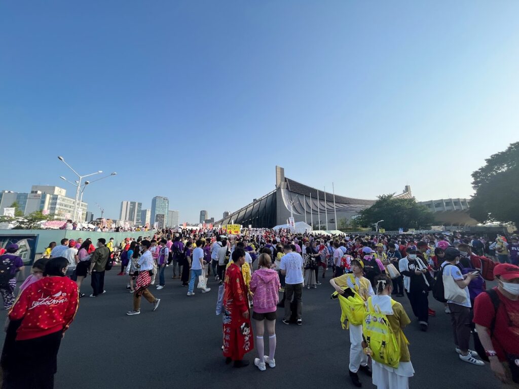 入場前の会場周辺はカラフルなファンが溢れた。