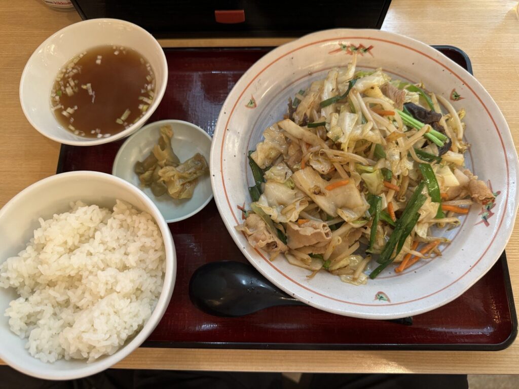 空港で野菜炒め定食。なんかほっとする。