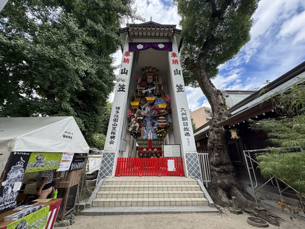 神社の周りには山笠の展示が複数あった。