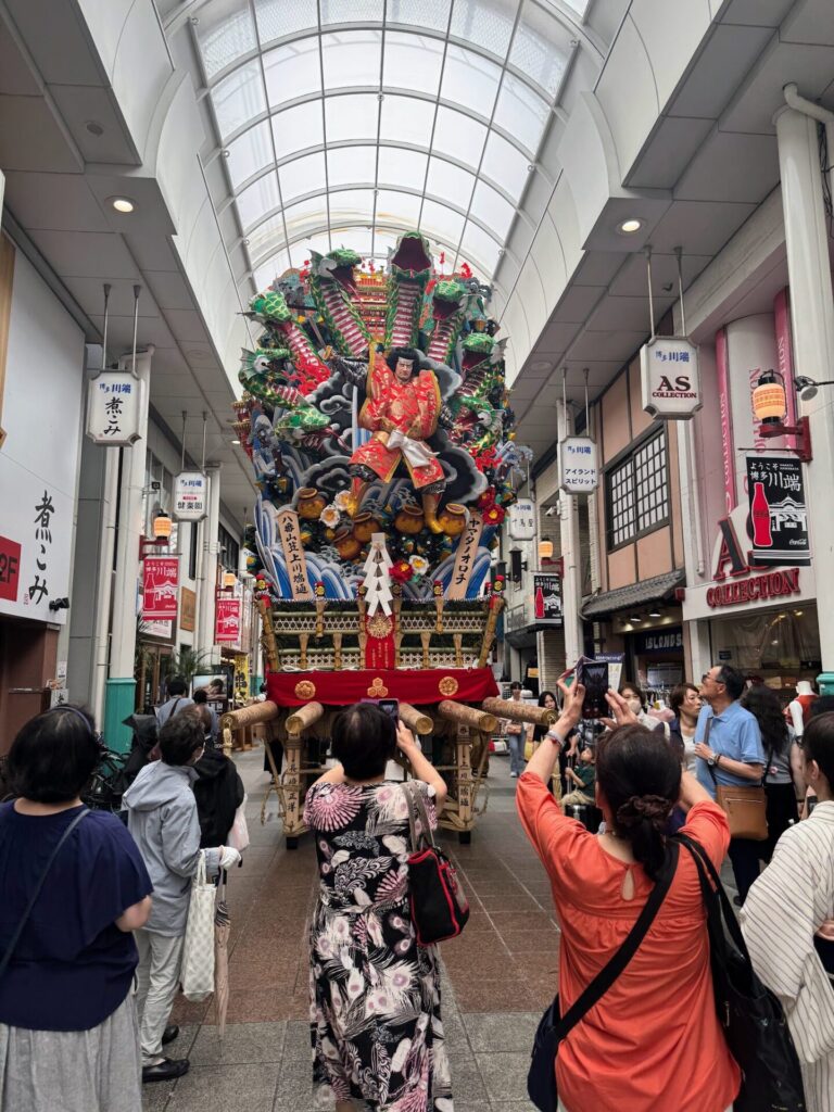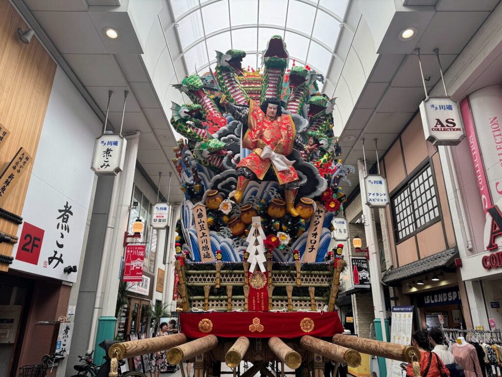 川端通り商店街のアーケードにもたくさんの山笠が展示されていた。